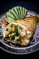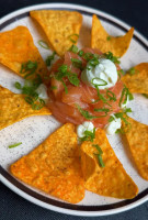 Hot roll recheado de salmão grelhado com cream cheese e Doritos no topo.