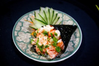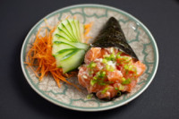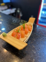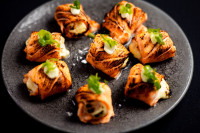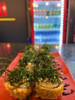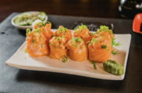 Bolinho de arroz, coberto por lâmina de salmão. Quantidade 8 peças Maçaricado ( Acréscimo de 5,00)