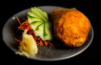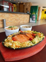 180g Salmão na Chapa, Porção de Feijão Tropeiro, Porção de Arroz Branco ou Yakimashe, Legumes Refolgados .