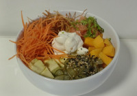 1 proteína da sua preferência: salmão cru,salmão grelhado,Camarão,Atum, kani 3 acompanhamento da sua preferência: abacate,manga,milho verde,cenoura ralada,cebola roxa,crispy batata doce, crispy couve,sunomono Complemento: cebolinha, Gergelim, amendoim, Shoyo e tarê