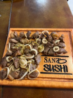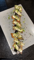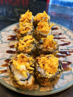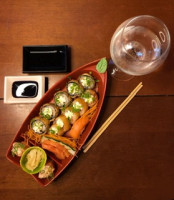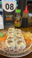 Sushi feito com uma fatia da pele do peixe grelhada ( skin ) sobre o arroz prensado, enrolado na alga. Porção com 8 unidades