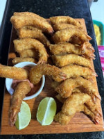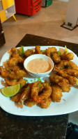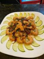 Camarão com casca, refolgado no azeite com alho picadinho e finalizado com cebola.