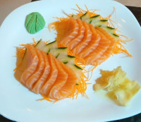 Lâminas de salmão finas, com gergelim e cebolinha, ao molho especial.