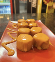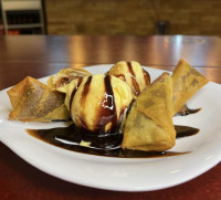 Rolinho frito de harumaki recheado com nutella. Acompanha duas bolas de sorvete e calda de chocolate para decorar.