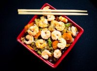 Macarrão oriental, legumes, molho especial a base de shoyu e frango. Porção de camarão, acréscimo de 10,00.