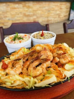 Macarrão oriental, legumes, molho especial a base de shoyu, carne bovina e frango. Porção de camarão, acréscimo de 15,00.